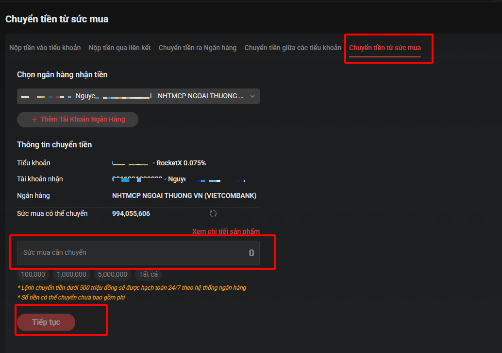 * **Bước 2:** Khách hàng chọn **Chuyển tiền từ sức mua**, Chọn tiểu khoản và điền số tiền cần chuyển, ngân hàng nhận . Điền số tiền cần chuyển, ấn **Tiếp tục** để thực hiện