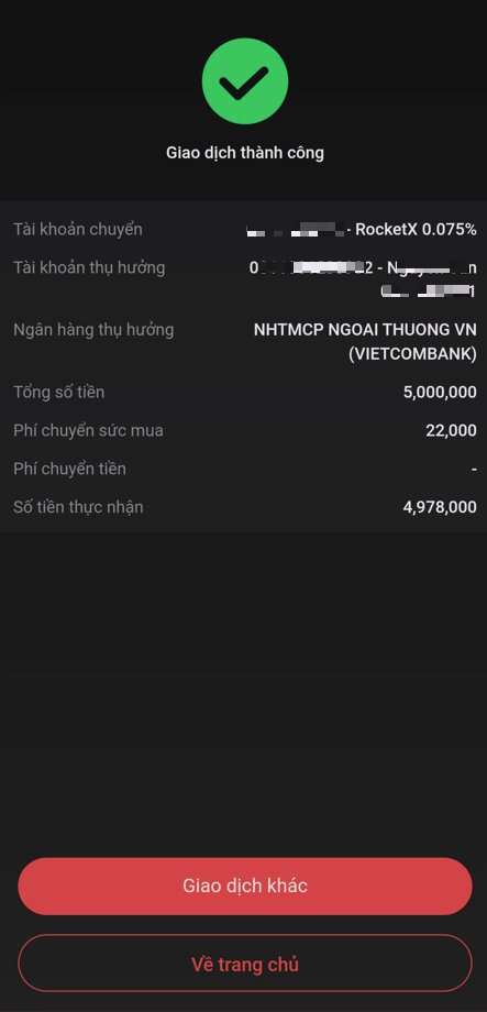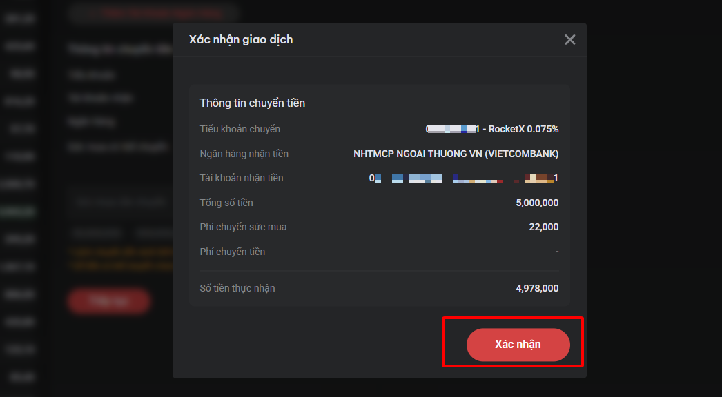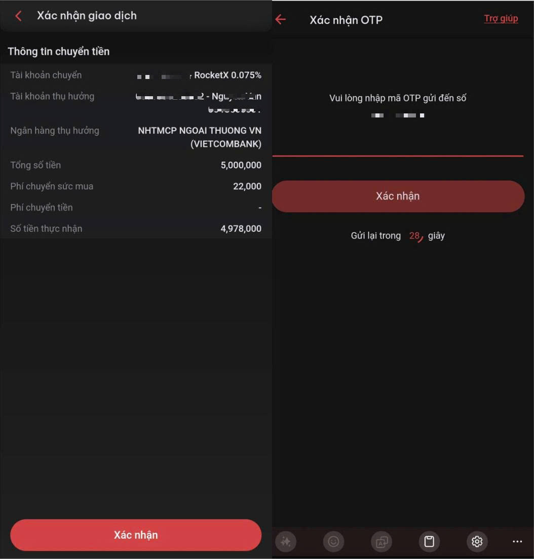 * **Bước 3:** Khách hàng kiểm tra lại giao dịch, ấn **Xác nhận** để tiếp tục thực hiện giao dịch