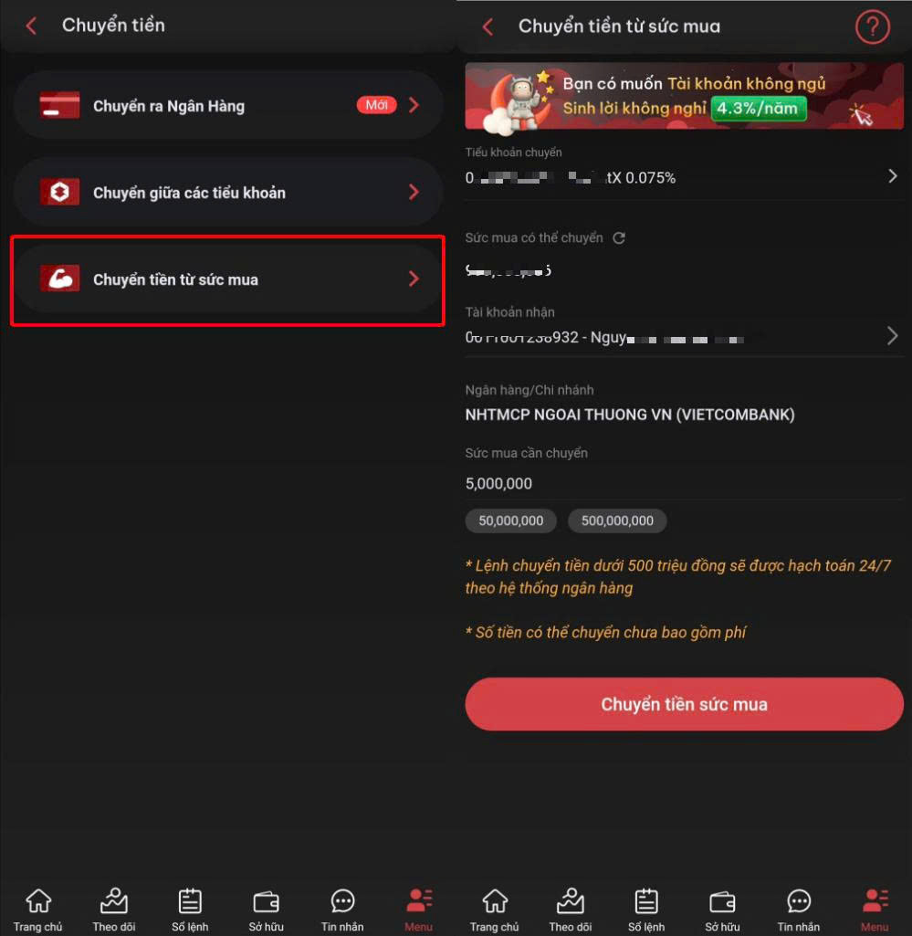 * *Phí dịch vụ chuyển tiền từ sức mua được tính trên <mark style="color:red;">**toàn bộ số tiền thực tế chuyển**</mark>**.** Nếu tài khoản của Khách hàng có tiền mặt/ tiền chờ về thì KH **nên thực hiện Ứng trước tiền bán và Rút tiền thông thường trước khi Chuyển tiền từ sức mua để tối ưu phí dịch vụ.***