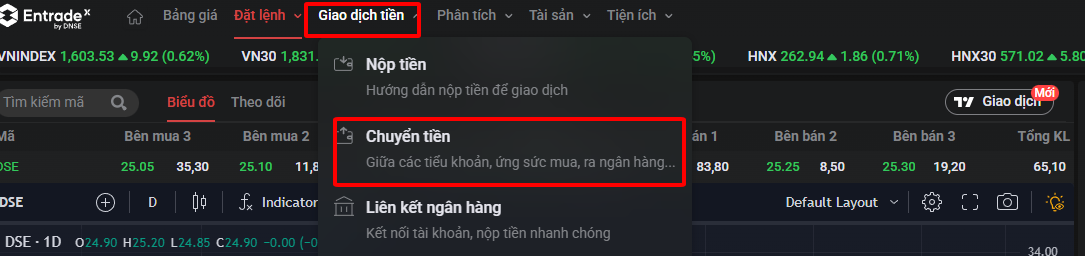 * **Bước 1:** Khách hàng đăng nhập vào web trading, chọn **Giao dịch tiền⇒ Chuyển tiền**