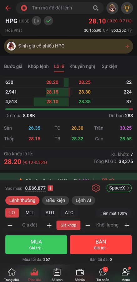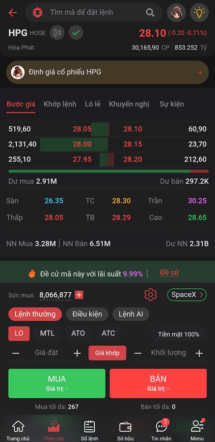 Thao tác đặt lệnh Mua/Bán cổ phiếu. Ngay khi chọn vào cổ phiếu thì hệ thống đã tính sẵn số lượng cổ phiếu Mua/Bán tối đa để người dùng dễ dàng lựa chọn Khối lượng đặt lệnh phù hợp