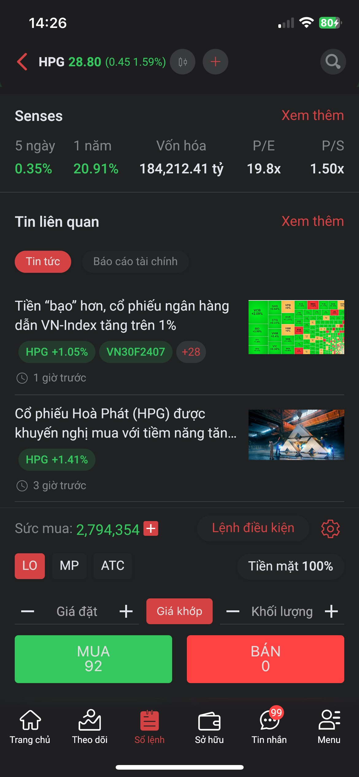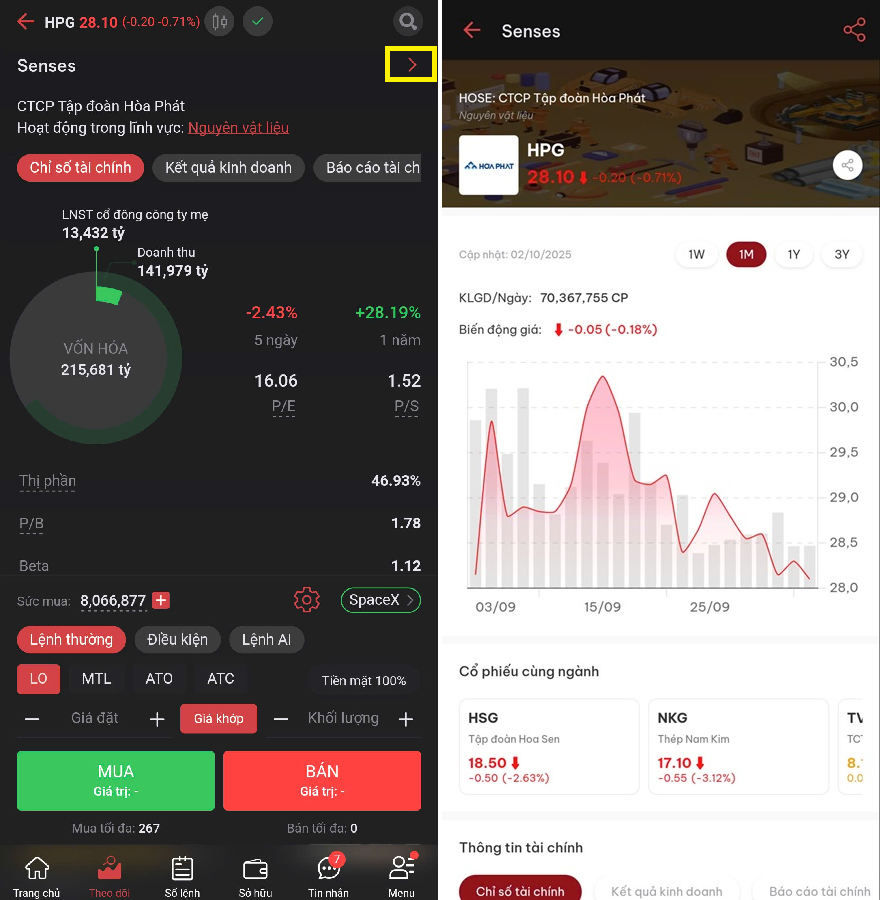Khi chọn vào một cổ phiếu đang theo dõi, người dùng sẽ chuyển sang màn hình giao dịch và các thông tin liên quan tới cổ phiếu đó