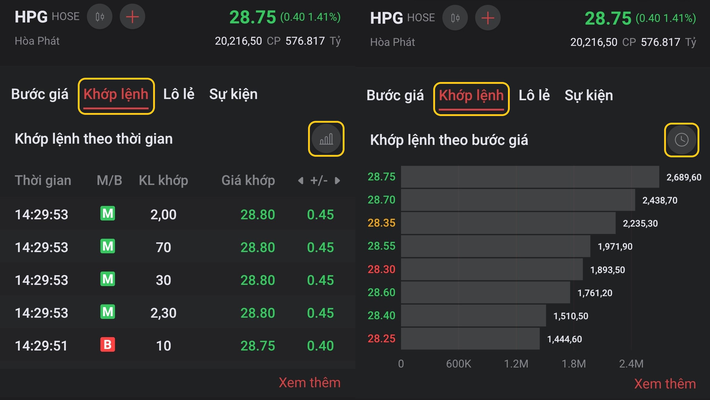 * <mark style="color:red;background-color:red;">**Khớp lệnh**</mark>: Lịch sử lệnh khớp theo thời gian và theo bước giá trong phiên