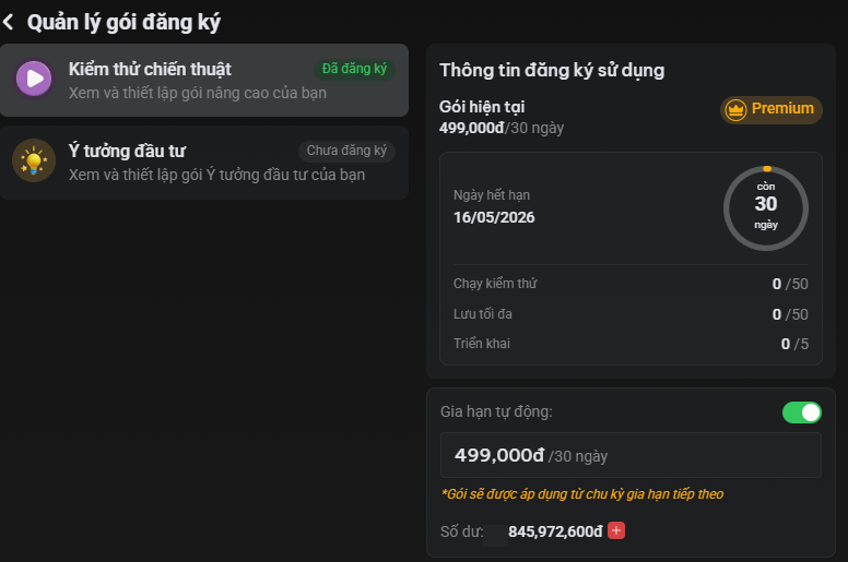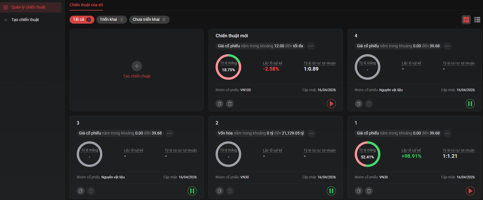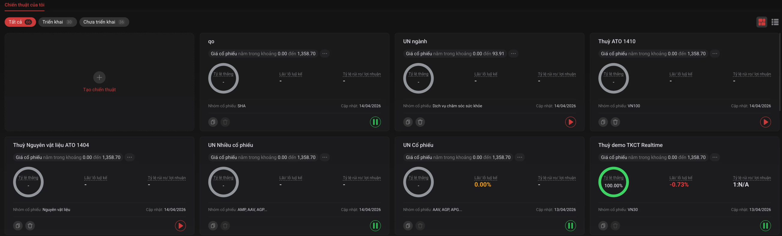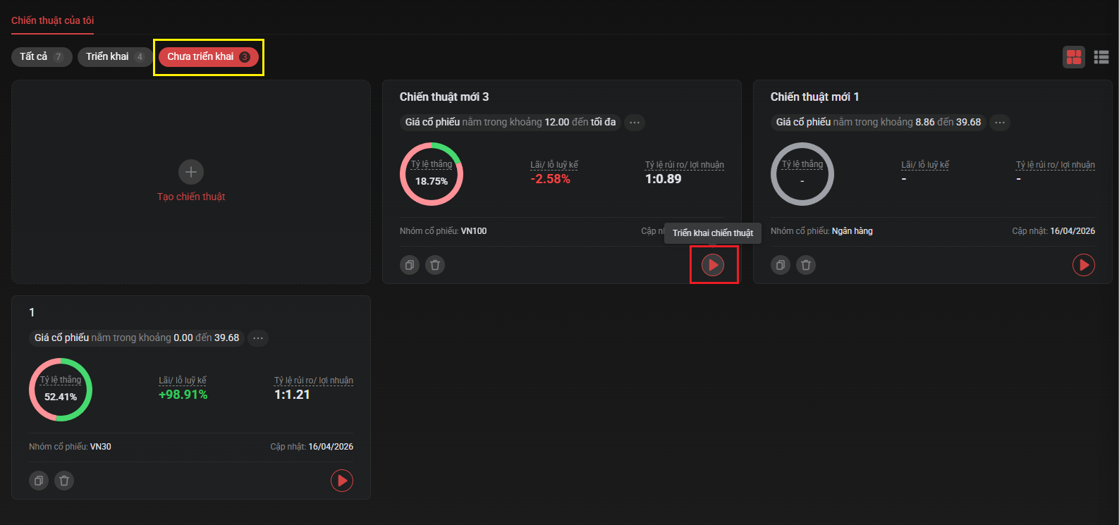 * Tùy theo trạng thái của chiến thuật (**Triển khai** hoặc **Chưa triển khai**), NĐT có thể thực hiện các thao tác tương ứng nhằm tối ưu quá trình kiểm thử và vận hành chiến lược: