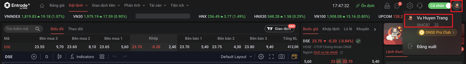 **Bước 1**: Đăng nhập tài khoản trên [webtrading](https://entradex.dnse.com.vn/kiem-thu-chien-thuat), chọn **Thông tin tài khoản**