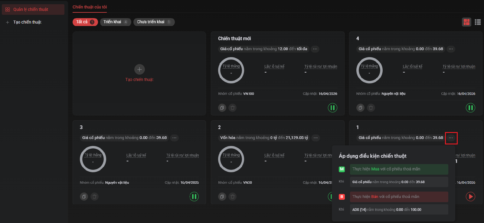 **Bước 2**: Chọn biểu tượng "**...**" để xem điều kiện chiến thuật cài đặt