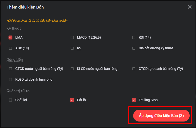 👉 Chỉ được chọn **tối đa 20 điều kiện Mua và Bán**