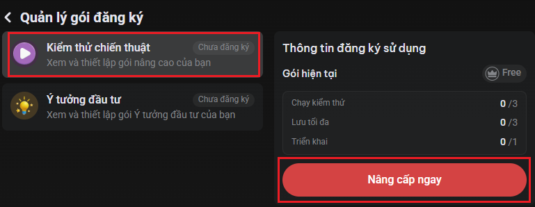**Bước 3**: Tại trang **Quản lý gói đăng ký**, chọn sản phẩm **Kiểm thử chiến thuật** -> chọn **Nâng cấp ngay**